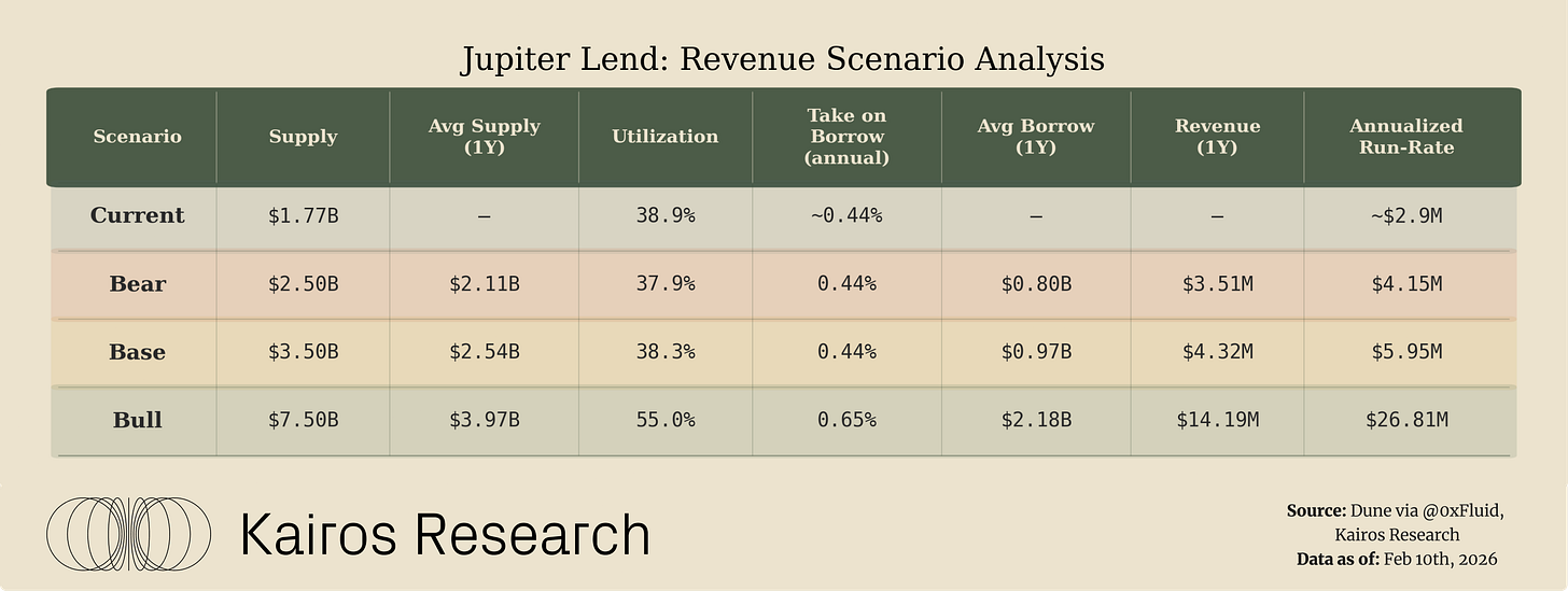 Our one year projections evaluate JupUSD across bear, base, and bull scenarios by varying two core inputs: total supplied JupUSD and utilization. Even under conservative assumptions, JupUSD begins to contribute incremental revenue as supply grows. In the bull case, where JupUSD reaches $1bn in supply and utilization converges toward levels observed in established stablecoins like USDC, JupUSD alone supports a multi million dollar annualized revenue run rate. While not intended to be a standalone profit engine, JupUSD materially strengthens Jupiter Lend’s unit economics and reinforces a self reinforcing liquidity flywheel across lending, swaps, and perps.