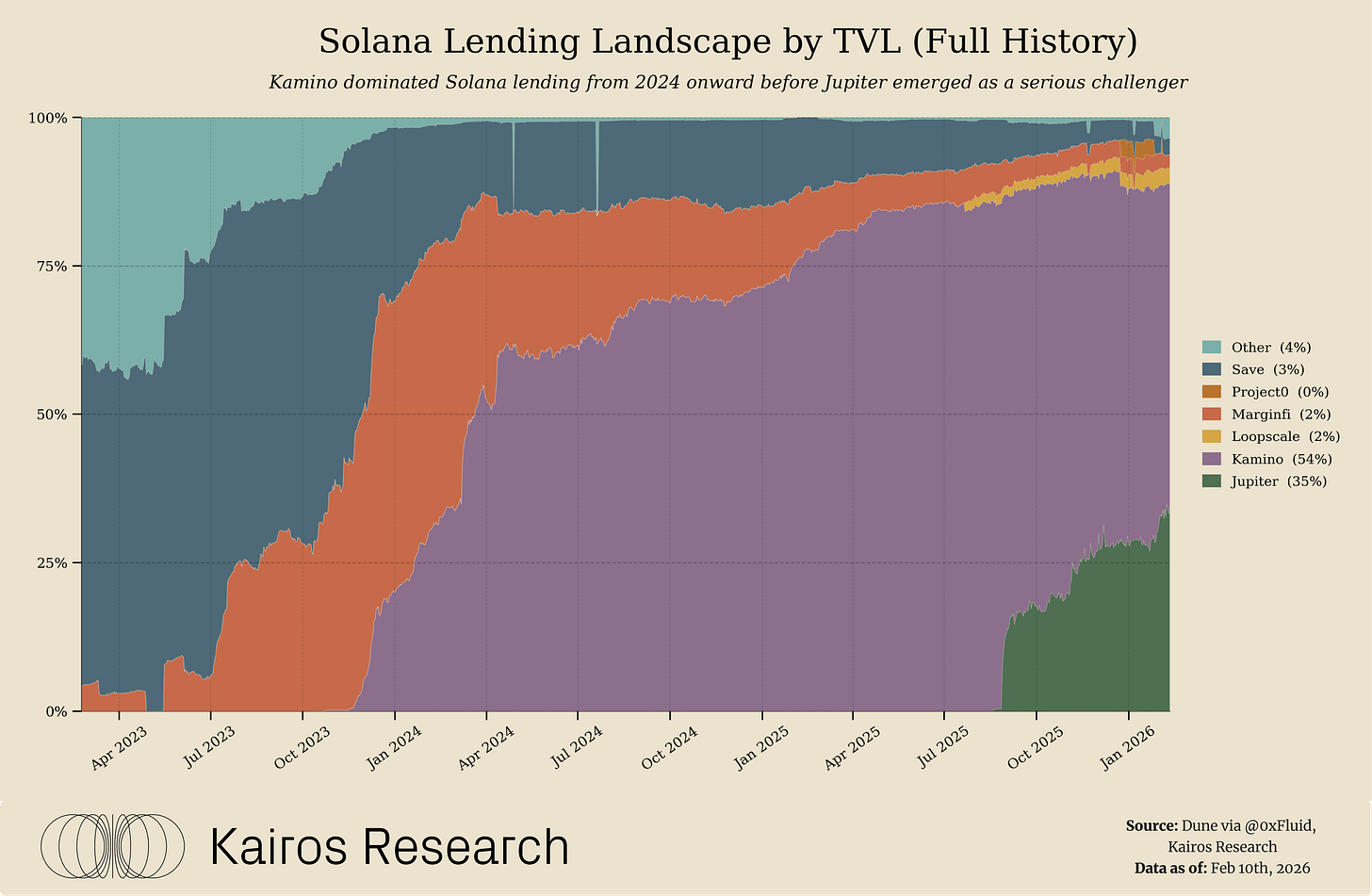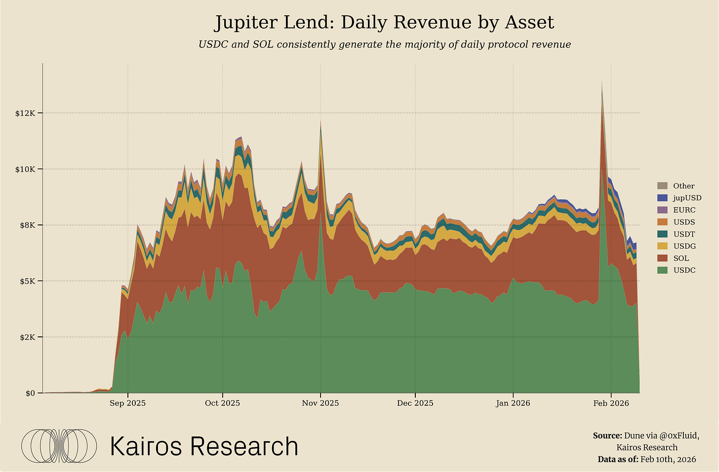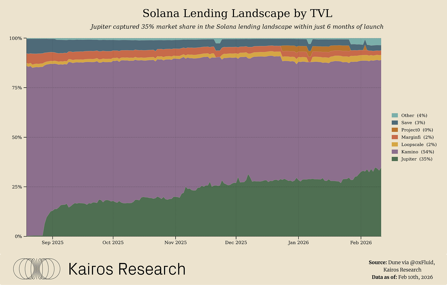 The primary risk is therefore less about hidden leverage and more about complexity and user expectation management. A shared liquidity layer is less intuitive than siloed pools, and users may assume “vault isolation” that does not exist. Jupiter and Fluid mitigate this through conservative collateral selection, dynamic risk limits, and a liquidation system designed to unwind risk via swap-based, incremental liquidations, helping contain stress even when liquidity is shared across products.Reliance on Incentives and Yield Sustainability: Much of Jupiter Lend’s early growth has been fueled by above-market yields, sweetened by token incentives and aggressive parameter tuning. While effective for bootstrapping, this strategy can be a double-edged sword. Continuously paying high APYs, either via token rewards or foregoing protocol fees to boost lender rates, is not sustainable indefinitely. It’s important to note the platform has never done the latter. Already, we see Jupiter is splitting interest revenues with Fluid and taking only a portion as platform income, which may limit its ability to keep subsidizing rates long-term. However, given both teams split revenue and incentives, this provides mutual skin in the game, providing an equal incentive structure for both teams. If market conditions shift, say borrowing demand falls or a competitor like Kamino ramps up their rates, Jupiter Lend may need to dial back yields. A potential stress point is when the initial reward programs conclude: will liquidity stick around for the product’s merits, or chase the next incentive elsewhere? Jupiter will need to carefully transition from incentive-led growth to organic growth. The encouraging sign is that Jupiter Lend generates real revenue, with over $10M cumulative interest paid by borrowers as of year-end 2025, so the platform could taper rewards if it maintains competitive features and UX. Still, investors should monitor yield levels on Jupiter Lend; a steep drop in APY could lead to outflows if not managed, and conversely, maintaining unsustainably high APYs could strain the system.