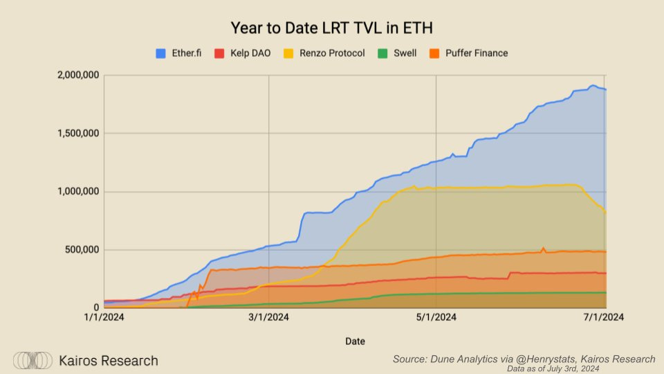 With regards to TVL, EtherFi has continued to climb higher, edging close to the 2m ETH mark. Following the withdrawals initiating for Renzo, there has been an outflow of around 200,000 ETH during the month of June, nonetheless they've held their place as the second largest LRT. Puffer and Swell are both yet to enable withdraws, but it is expected that they should be soon.