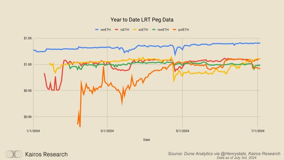 Following the introduction of Renzo enabling withdrawals, their peg notably Improved. Puffer saw a brief dip over June, but remains on a decent level. Swell's rswETH is now the main outlier which is around a 1.8% discount at the time of writing. However, it is very likely it follows a similar pattern to Renzo once withdrawals have been enabled.