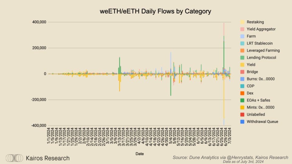 With EOAs + Safes seeing their largest influx to date, and with AVS rewards looming in the near future, it is likely we will see additional protocols working around the LST/LRT DeFi space launch incentive programs to help bootstrap their networks.