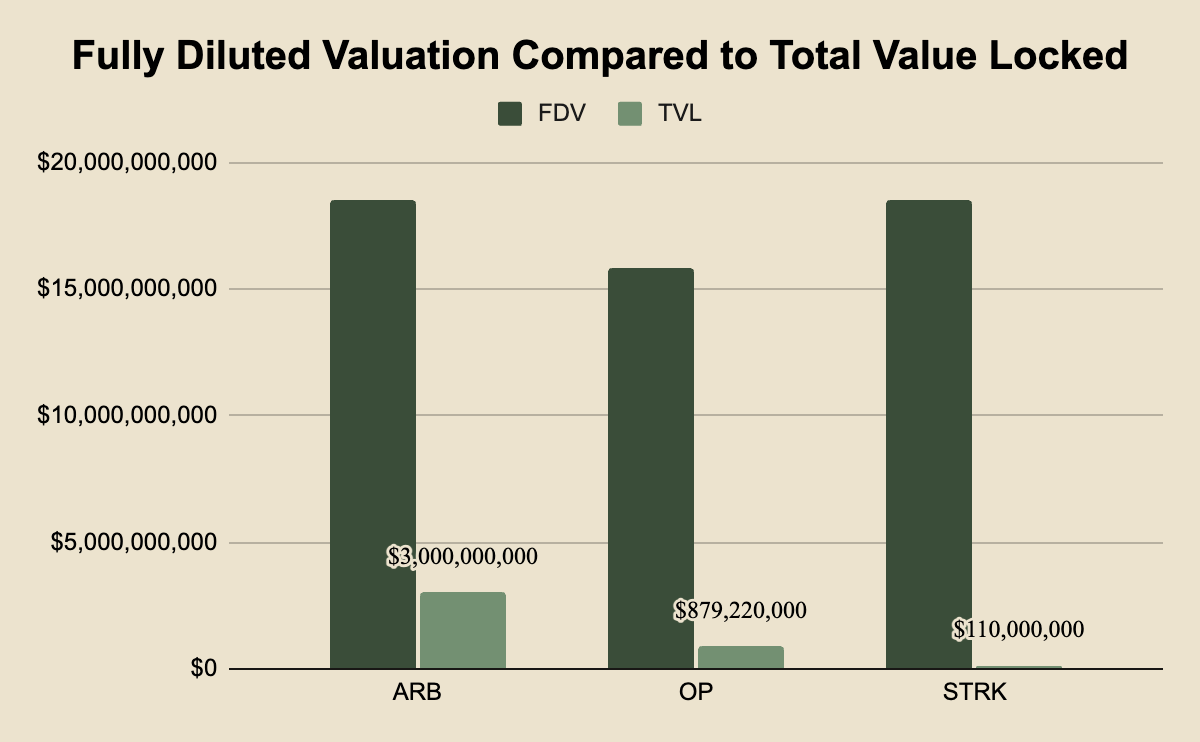 To go deeper on that 3rd point, the staking mechanism which was covered in the demand dynamics section could potentially absorb a notable amount of the overall circulating supply if the mechanics are sound enough. If tens / hundreds of millions of dollars in fees are being paid in transaction fees on Starknet, validating the network becomes quite lucrative, inviting market participants to buy STRK and stake in order to reap the benefits. Further, allowing STRK to be used as a gas token could drive consistent demand over the long run given sustained network usage.