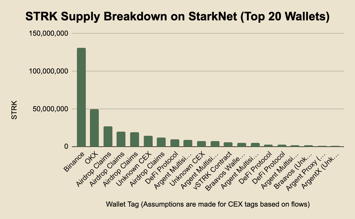 When looking at the onchain breakdown of the supply, it's a bit messy. While the entire STRK supply exists on L1 Ethereum, the token airdrop provisions were issued on the Starknet L2. The onchain liquidity for STRK is decent, but not great with about $8m of pool liquidity across ETH-STRK & USDC-STRK pairs on Ekubo, the chain’s largest DEX with a TVL of ~$20m.
