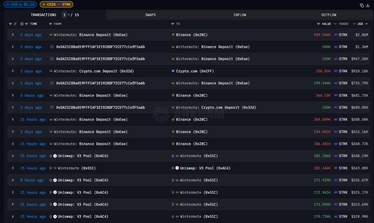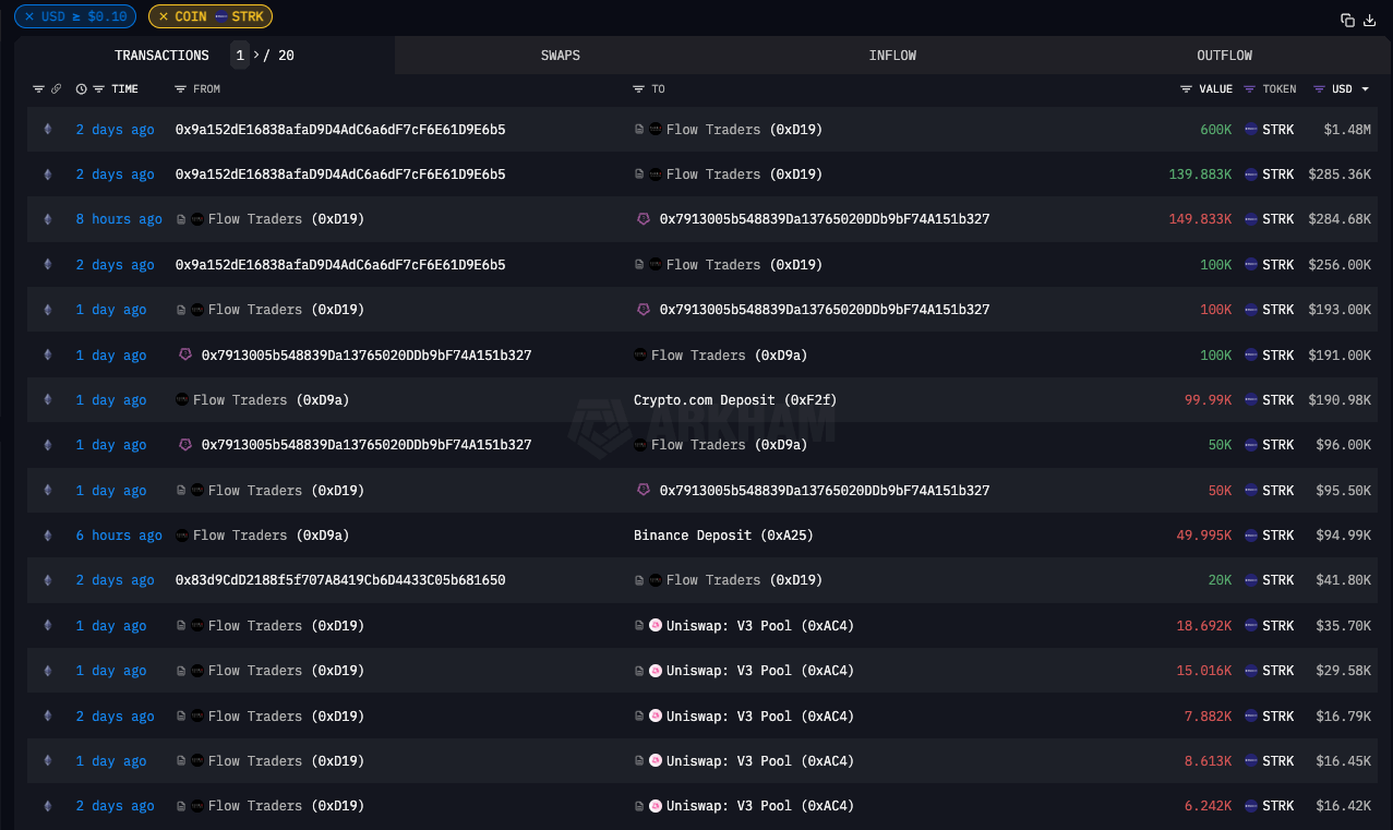 The Eth L1 flows for STRK are mainly dominated by Flow Traders & Wintermute who appear to be the designated market makers for STRK, given their large deposits to Binance & the UniV3 pool.