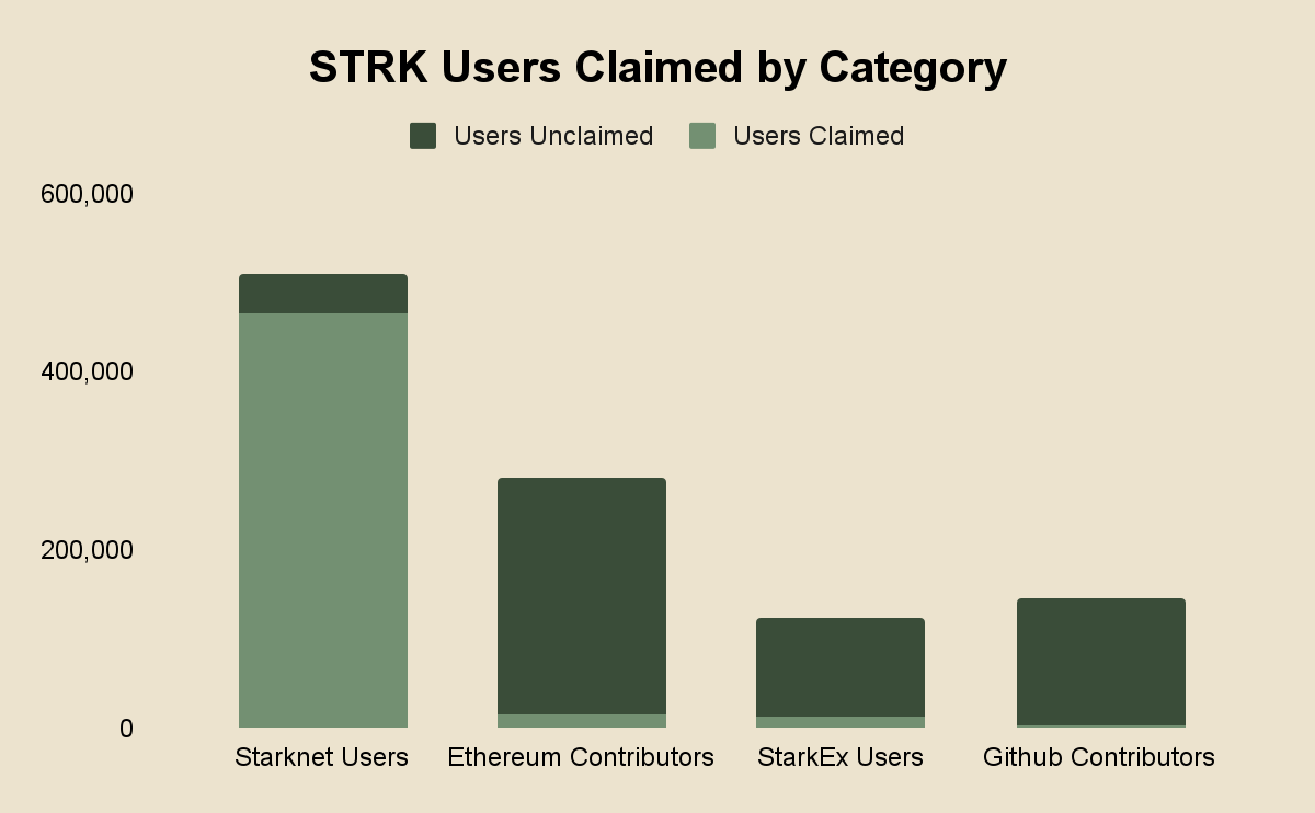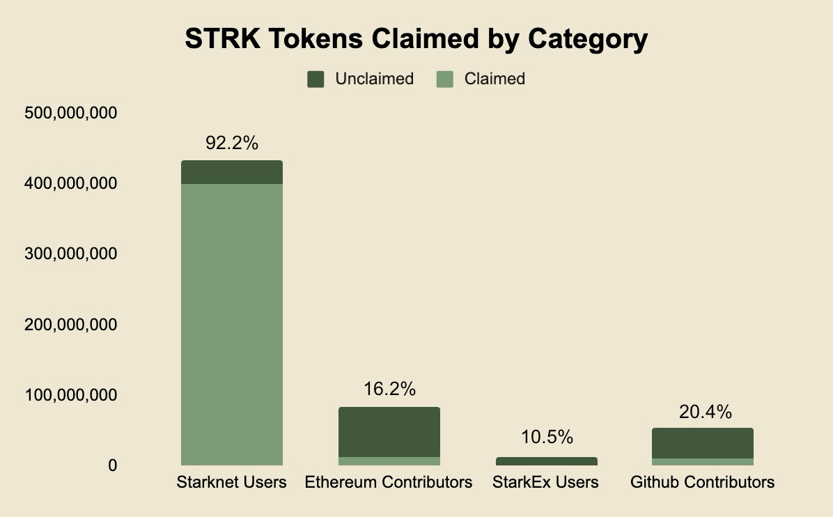 It’s important to note that users have until June 20th, 2024 to claim their tokens - otherwise they will be collected and redistributed in subsequent provisions rounds. At the time of writing, 72% of tokens have been claimed. There is also a notable difference between claims by category, but this makes sense given Starknet users were the party likely anticipating this event the most versus the others.