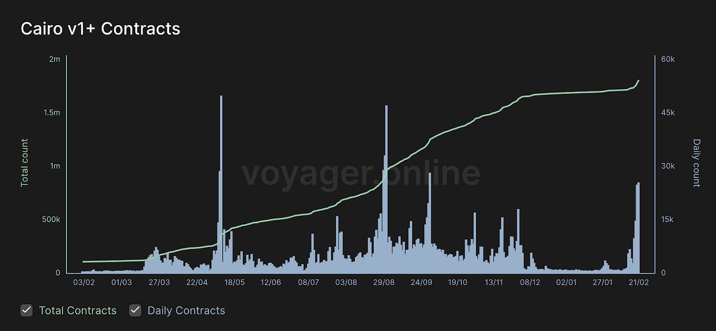 It’s also notable that development activity on Starknet appeared to slow down significantly post-snapshot, with daily contract deployments in December and January falling to their lowest levels since launch. Activity will likely come back with token incentives and returned user interest, but it would be very worthwhile to watch nonetheless. As of today, a majority of the largest applications on Starknet are recycled DeFi primitives, which are important especially while building an ecosystem - but Starknet has yet to find its “killer dapp” that is exciting enough to drive new users.