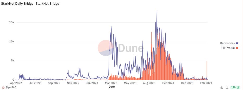 Further, the amount of ETH bridged to Starknet slowed dramatically leading into the airdrop announcement. However, as mentioned earlier, the new STRK liquidity injection could potentially have positive second and third order effects.